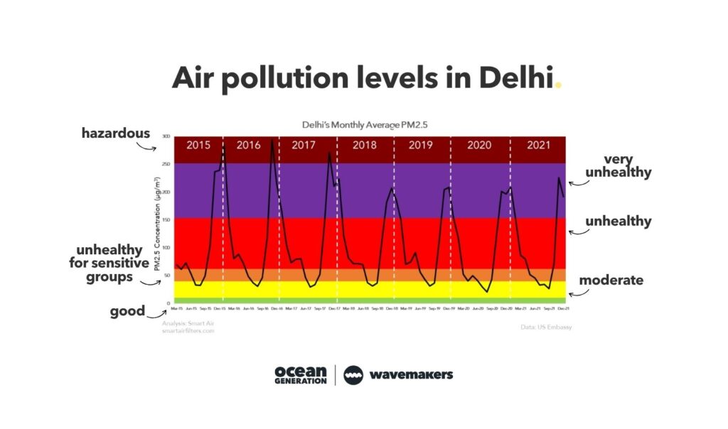 Delhi’s average PM2.5 level is 140, far above the WHO’s recommended 10µg/m³.